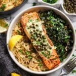 Keywords: Salmon Piccata, Quick Salmon Recipe, Lemon Caper Sauce, Orzo Pasta, Sautéed Greens, Healthy Dinner, Weeknight Meal