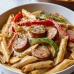 Andouille Fajita Pasta is a flavorful, creamy dish combining spicy Andouille sausage with sautéed bell peppers and onions, tossed with penne pasta in a rich tomato and cheese sauce. This recipe blends Cajun-inspired sausage with fajita-style vegetables, creating a comforting, hearty meal perfect for dinner.