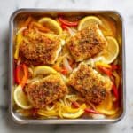 Keywords: baked tilapia, lemon garlic sauce, healthy fish recipe, easy seafood dish, baked fish with peppers and onions