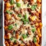 This hearty Baked Ziti with Sausage and Ricotta features tender pasta enveloped in a rich tomato and Italian sausage sauce, layered with creamy ricotta and topped with bubbly mozzarella and Parmesan cheeses. Finished with fresh basil garnish, it’s a comforting Italian-American classic perfect for family dinners or entertaining guests.