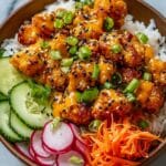 A flavorful Bang Bang Chicken Bowl featuring crispy pan-fried chicken coated in a spicy mayo sauce served over jasmine rice with fresh veggies like shredded lettuce, cucumber, carrots, and green onions. This recipe offers an easy and delicious meal option with customizable protein choices such as shrimp or tofu.