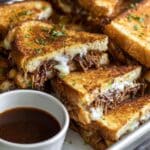 This Birria Grilled Cheese recipe combines tender, slow-cooked chuck roast in rich enchilada sauce with gooey melted cheese between buttery toasted Texas toast slices. The dish features a flavorful Mexican-inspired slow-cooked meat, balanced by queso fresco and mozzarella, and served with dipping broth for an indulgent grilled cheese experience perfect for a hearty meal.