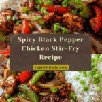 This Black Pepper Chicken is a flavorful and quick stir-fry dish featuring tender boneless chicken thighs marinated in freshly ground black pepper, cooked with crisp green bell peppers, onions, and a savory blend of soy and oyster sauces. Easy to prepare and perfect for a hearty weeknight meal, it combines spicy, savory, and slightly sweet elements for a deliciously balanced dish.
