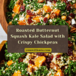 A vibrant and nutritious Butternut Squash Kale Salad featuring roasted butternut squash and crispy chickpeas, balanced with quinoa, kale, feta, dried cranberries, and pecans, all tossed in a tangy apple cider vinegar vinaigrette. This wholesome salad is perfect for a hearty lunch or a light dinner.