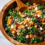 A vibrant and nutritious Butternut Squash Kale Salad featuring roasted butternut squash and crispy chickpeas, balanced with quinoa, kale, feta, dried cranberries, and pecans, all tossed in a tangy apple cider vinegar vinaigrette. This wholesome salad is perfect for a hearty lunch or a light dinner.