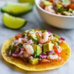 PrintCeviche with Shrimp, Avocado, and Tomato Served on Tostadas Recipe