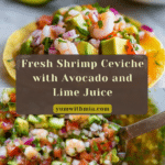 This fresh and zesty shrimp ceviche features tender shrimp marinated in lime juice and mixed with crisp cucumber, creamy avocado, juicy tomatoes, sharp red onion, vibrant cilantro, and a touch of jalapeno heat. Enhanced with clamato juice and served with crunchy tostadas or tortilla chips, this dish is a perfect light appetizer or snack bursting with bright flavors and a hint of spice.