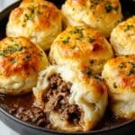 Cheesy Beef Biscuit Bombs are a delicious and indulgent appetizer or snack featuring seasoned ground beef combined with a trio of cheeses, all encased in flaky, golden baked biscuit dough. Perfectly baked to a crispy finish with melted butter, these bombs deliver a savory, melty explosion of flavor in every bite.