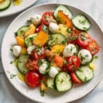 A refreshing and vibrant Cherry Tomato Salad featuring juicy nectarines, crisp cucumber, and creamy Ciliegine mozzarella, dressed with a tangy champagne vinegar and lemon vinaigrette. Perfect as a light appetizer or a summer side dish.