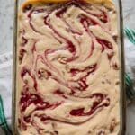 - Add cranberry swirl: Scoop dollops of the cream cheese mixture and the whole berry cranberry sauce over the cake batter in the baking dish. Use a knife or skewer to lightly swirl these toppings into the batter, creating a marbled effect without mixing completely.