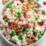 This festive Christmas Popcorn Recipe combines salty popcorn with sweet white chocolate, colorful red and green M&Ms, crushed candy canes, and holiday sprinkles for a fun and delicious holiday treat that’s perfect for sharing or gifting during the festive season.