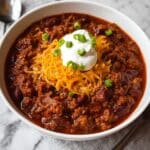 - Serve and Garnish: Spoon the chili into bowls and top with shredded cheddar cheese, a dollop of sour cream, and chopped green onions. Add crunchy tortilla chips on the side for extra fun and texture.