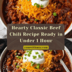 Keywords: Beef chili, classic chili recipe, ground beef chili, hearty chili, easy chili recipe, stovetop chili, chili with beans