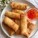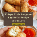 Delicious Crab Rangoon Egg Rolls combine creamy, savory crab and cream cheese filling wrapped in crispy fried egg roll wrappers. Perfect as an appetizer or snack, these homemade egg rolls are bursting with flavor and served with sweet chili sauce for dipping.