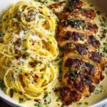 - Serve: Plate the creamy Cajun spaghetti and top with the seared Cajun chicken strips. Garnish with freshly chopped parsley. Serve immediately for best flavor and texture.