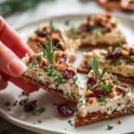 - Add the Festive Toppings: Mix chopped pecans, dried cranberries, and parsley in a small bowl. Sprinkle evenly over the cream cheese layer and lightly press to adhere. Optionally, drizzle honey or maple syrup for a shiny festive glow.