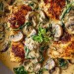 Keywords: creamy mushroom chicken, Mediterranean chicken recipe, chicken with mushrooms and spinach, easy chicken dinner, one-pan chicken recipe