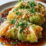 - Serve: Remove the cabbage rolls from the oven, drizzle generously with the warm ginger soy glaze, and serve immediately for best flavor and texture.