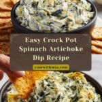 This creamy Crock Pot Spinach Artichoke Dip is a warm, cheesy appetizer perfect for parties or gatherings. Combining fresh spinach, artichoke hearts, and a blend of cheeses slow-cooked to perfection, it’s an easy and delicious dip to serve with crackers, chips, or bread.