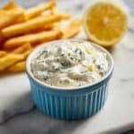 This Dill Tartar Sauce is a creamy, tangy condiment made with mayonnaise, finely chopped dill pickles, fresh dill, and a hint of lemon juice and sugar. Perfect as a dip or accompaniment for seafood, sandwiches, and more, it combines fresh and zesty flavors with a crunchy texture from the pickles and a subtle onion bite.