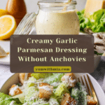 This flavorful Dressing Without Anchovies is a creamy, garlicky alternative to traditional Caesar dressing, perfect for those who prefer to skip anchovies. Made with mayonnaise, garlic, Dijon mustard, lemon juice, caper brine, anchovy-free Worcestershire sauce, and Parmesan cheese, this dressing brings rich umami taste and bright acidity to your salads without any fishy flavors.
