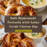 This Easy Homemade Soft Pretzels recipe delivers classic, soft pretzels with a golden crust and chewy, tender interior, perfect for snacking or dipping in a creamy salsa verde cheese sauce. The recipe includes a simple dough prepared with active dry yeast and baking soda bath for the distinctive pretzel texture and flavor, finished in the oven for a beautifully baked crust.