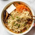 - Serve and Garnish: Remove the pot from heat and ladle the ramen into bowls. Garnish generously with extra sliced scallions, sesame seeds, additional shredded carrots, sliced extra-firm tofu, and an extra drizzle of hot sauce. Serve immediately and enjoy a warm, comforting vegan meal.
