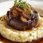 A classic and indulgent filet steak recipe served with sweet caramelized onions and creamy garlic mashed potatoes, finished with a savory pan gravy. Perfectly seared steaks with a herbaceous crust complement the rich mashed potatoes and deeply caramelized onions for a comforting yet elegant meal.