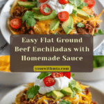 These Flat Ground Beef Enchiladas offer a delicious and simplified twist on the classic Mexican favorite. Ground beef is cooked with onions and garlic, simmered in a homemade enchilada sauce, and served on lightly fried corn tortillas. Topped with melted Colby Jack cheese and fresh garnishes like avocado, tomato, sour cream, cilantro, and black olives, this dish is hearty, comforting, and perfect for a satisfying weeknight dinner.