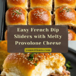 Keywords: French Dip Sliders, roast beef sliders, caramelized onions, provolone cheese sliders, au jus sandwiches, party appetizers