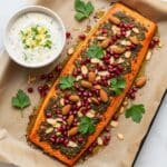 - Serve with Sauces and Garnishes: Top the rested salmon with the prepared dill sauce and cranberry-almond tapenade. Scatter pomegranate seeds and fresh parsley on top, and drizzle with lemon juice for a bright, festive finish.