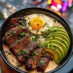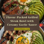 This Grilled Steak Bowl combines juicy marinated flank steak with fresh avocado slices, tangy corn salsa, and creamy garlic sauce, topped with soft-boiled eggs for a balanced, flavorful meal. Served over rice or quinoa, this bowl is perfect for a hearty lunch or dinner with vibrant textures and bold flavors.