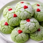These festive Grinch Cookies are a delightful twist on classic cake mix cookies, infused with refreshing peppermint and mint extracts and bright green food coloring to capture the holiday spirit. Soft, chewy, and perfect for Christmas celebrations, they are finished with a charming red heart sprinkle to symbolize the Grinch’s growing heart.