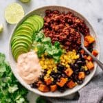 - Assemble Bowls: Divide the cooked beef evenly among four bowls. Top with the roasted sweet potato, corn, and black bean mixture. Add diced avocado on top.