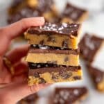 - Chill and serve: Place the assembled cookie dough bark in the freezer for 10 minutes to allow it to set firmly. Once set, remove from the freezer and chop into large chunks. Serve immediately or store in an airtight container in the refrigerator.