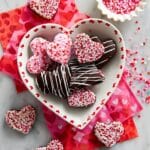 - Decorate with white chocolate and sprinkles: Melt the white chocolate separately, transfer it into a piping bag or a small plastic bag with a corner snipped off, then drizzle it over the coated hearts. Immediately sprinkle with colorful sprinkles before the drizzle sets.