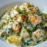 This High Protein Spinach and Artichoke Chicken Casserole is a flavorful, creamy, and cheesy dish packed with shredded chicken, fresh spinach, and tender artichokes. Perfect for a healthy family meal, it blends Greek yogurt and light cream cheese for a rich yet nutritious twist on a classic casserole.