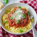 - Step 6: Taste and adjust seasoning with additional salt and pepper if needed. Serve hot over cooked spaghetti or your favorite pasta. Garnish with grated Parmesan and chopped parsley or basil if desired.