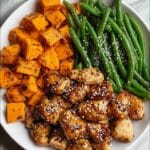 Honey Garlic Chicken with Roasted Sweet Potatoes and Green Beans Recipe