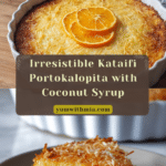 Kataifi Portokalopita with Coconut is a luscious Greek dessert combining crispy kataifi pastry strands baked with aromatic coconut and drenched in a zesty orange syrup. Topped with a smooth orange-infused Greek yogurt custard, this treat offers a delightful texture contrast and a perfect balance of sweetness and citrus flavor.
