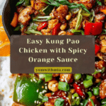A flavorful and vibrant Kung Pao Chicken recipe featuring tender, marinated chicken pieces seared to perfection, sautéed crisp-tender vegetables, and a tangy, sweet, and spicy orange chili sauce. Garnished with roasted peanuts, green onions, and sesame seeds, this dish delivers classic Chinese flavors with a fresh citrus twist, perfect served over hot rice.