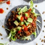 The lentil filling freezes well. Store it in a freezer-safe container for up to 3 months. Thaw overnight in the fridge and reheat completely before assembling tacos. Fresh toppings and tortillas should be added just before serving.