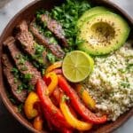 This Low Carb Steak Fajita Bowl is a vibrant, flavorful keto-friendly meal featuring tender marinated flank steak, sautéed bell peppers and onions, and seasoned cauliflower rice. Topped with creamy avocado, fresh salsa, dairy-free sour cream, and cilantro, it’s a fresh, low-carb twist on classic fajitas, perfect for a healthy and satisfying dinner.
