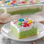 - Decorate the Cake: Spread the frosting evenly over the cooled cake. Top with rainbow sprinkles and the reserved Lucky Charms marshmallows to finish the look. Slice and serve.