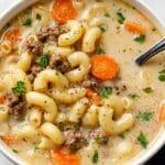 Keywords: macaroni cheeseburger soup, ground beef soup, comfort food soup, cheddar cheese soup, easy weeknight soup