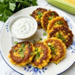 Keywords: Mediterranean corn fritters, feta corn pancakes, Greek yogurt fritters, savory corn snacks, vegetarian appetizers