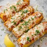 Keywords: Mexican street corn, elote, roasted corn, cotija cheese, chipotle chili powder, lime, garlic mayonnaise, Mexican side dish