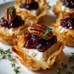 These Mini Phyllo Cups with Brie, Pecans, and Cranberry Drizzle are an elegant and easy-to-make appetizer perfect for holiday gatherings or special occasions. Crispy phyllo shells are filled with creamy melted Brie, topped with toasted pecans for a delightful crunch, and finished with a sweet-tart cranberry and honey drizzle complemented by fresh thyme for an aromatic touch.