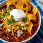 - Season and serve: Taste the chili and adjust seasoning with additional salt and pepper if needed. Serve hot with your choice of toppings such as cheese, onions, sour cream, cilantro, and Fritos.
