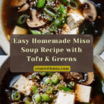 This traditional Japanese Miso Soup recipe features a savory broth infused with sautéed leeks and shiitake mushrooms, enriched with flavorful miso paste and complemented by tender greens and silken tofu. Garnished with scallions and toasted sesame seeds, this comforting soup is perfect for a light, nourishing meal or appetizer.
